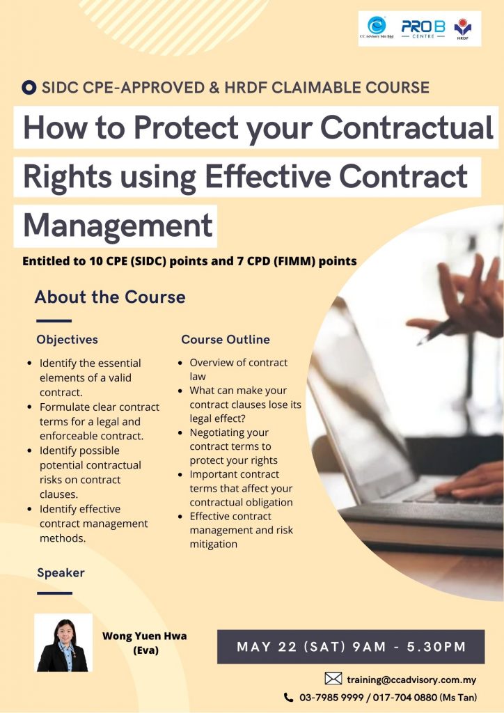 As a licensed financial planner, contract management to businesses is very important. This is because that poor contract management can lead to disputes which subsequently affect the financial situation and reputation of a company. Want to know more on how to protect your contractual rights using effective contract management? Join us to know more now!